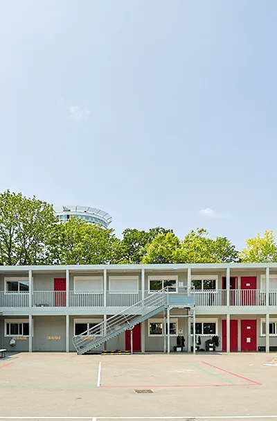 Lorsque les effectifs augmentent durablement, des bâtiments modulaires peuvent être ajoutés aux infrastructures existantes. Cette solution pérennise la capacité d’accueil tout en maintenant une esthétique cohérente avec le bâti en place.